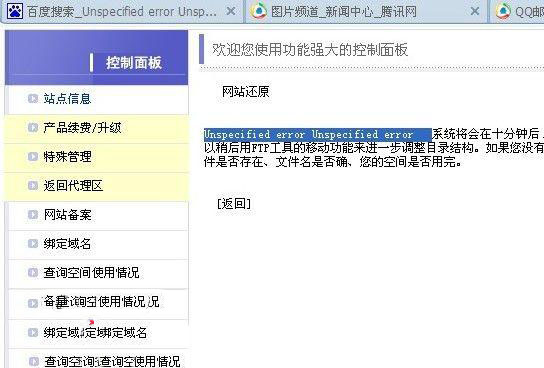今天客戶在線解壓出現了Unspecified error 的錯誤,我以為是被控的權限,重新重置了受控端依然不行,訪問被控依然正常,但http://受控域名/freehost.dll就出現錯誤,看樣子不是IIS或者互相訪問的問題了,肯定是某個星外組件出了問題;